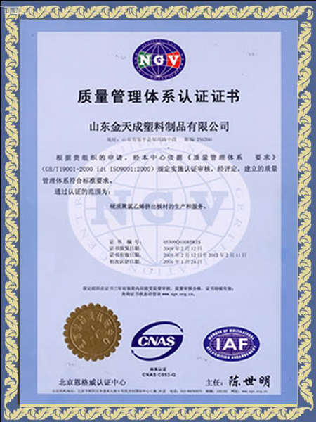 山東金天成塑料制品有限公司成立于2000年,二十年來(lái)致力于工程塑料板研究與開(kāi)發(fā),并通過(guò)ISO9001:2015質(zhì)量管理體系認(rèn)證和ISO14001:2015環(huán)境管理體系認(rèn)證。金天成地處山東鄒平市,臨近濟(jì)南機(jī)場(chǎng),注冊(cè)資金1000萬(wàn)元。 擁有十幾條板材生產(chǎn)線(xiàn),年產(chǎn)量2萬(wàn)噸。同時(shí)擁有具備行業(yè)知識(shí)的生產(chǎn)技術(shù)人員和掌握經(jīng)營(yíng)運(yùn)作的管理人員。